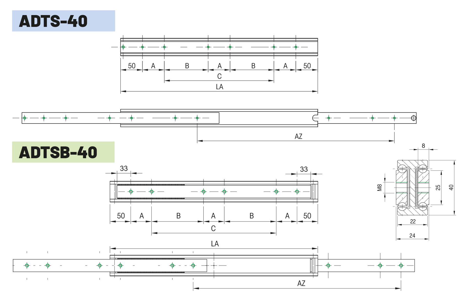 The low weight ADTSB-40 slide has a loading of 125kg at 600mm. The slide is designed for full travel front and rear. This is facilitated by an internal rocker system which holds and releases beams in sequence. The first beam will extend fully and only at that point will the second beam be released.