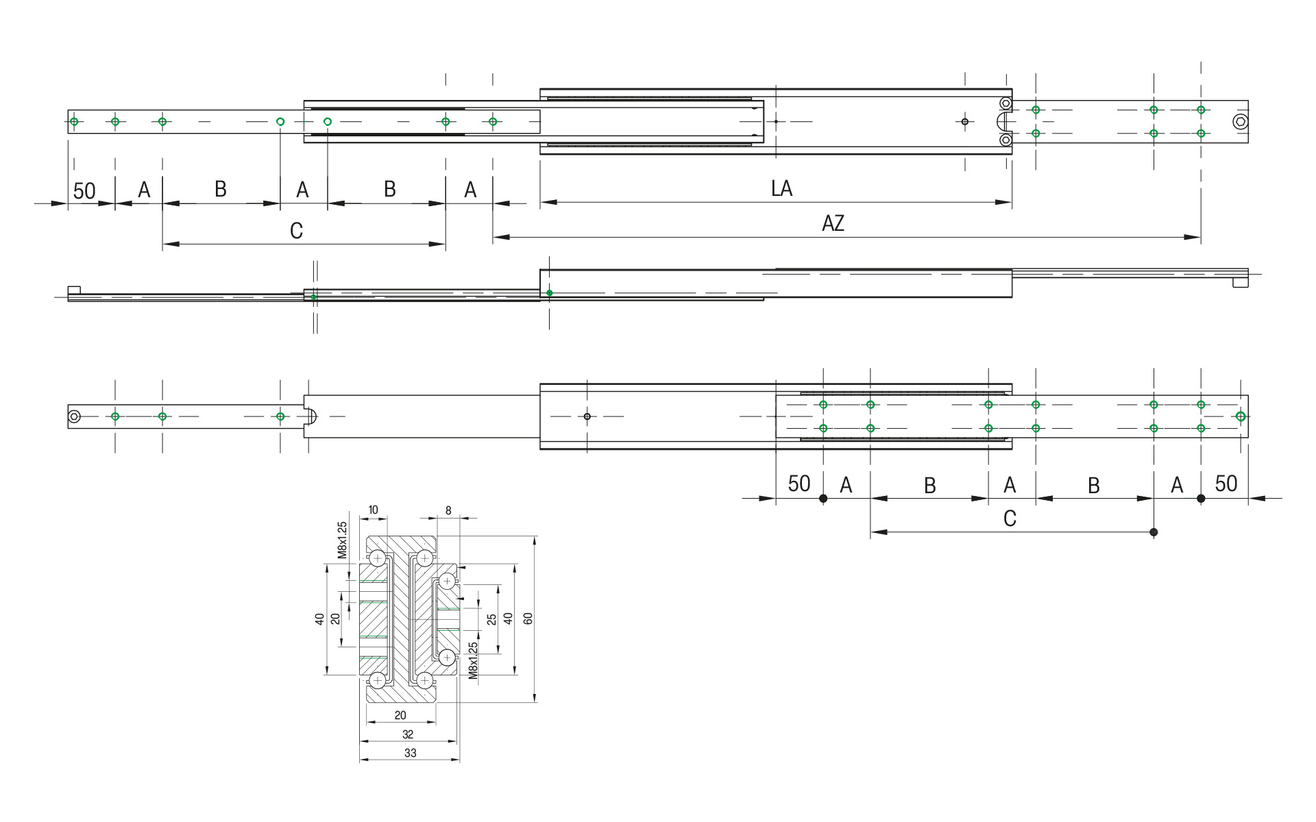 Cross section: 33 x 60 mm | Length: 200 up to 1600 mm | Super extension slides 200%